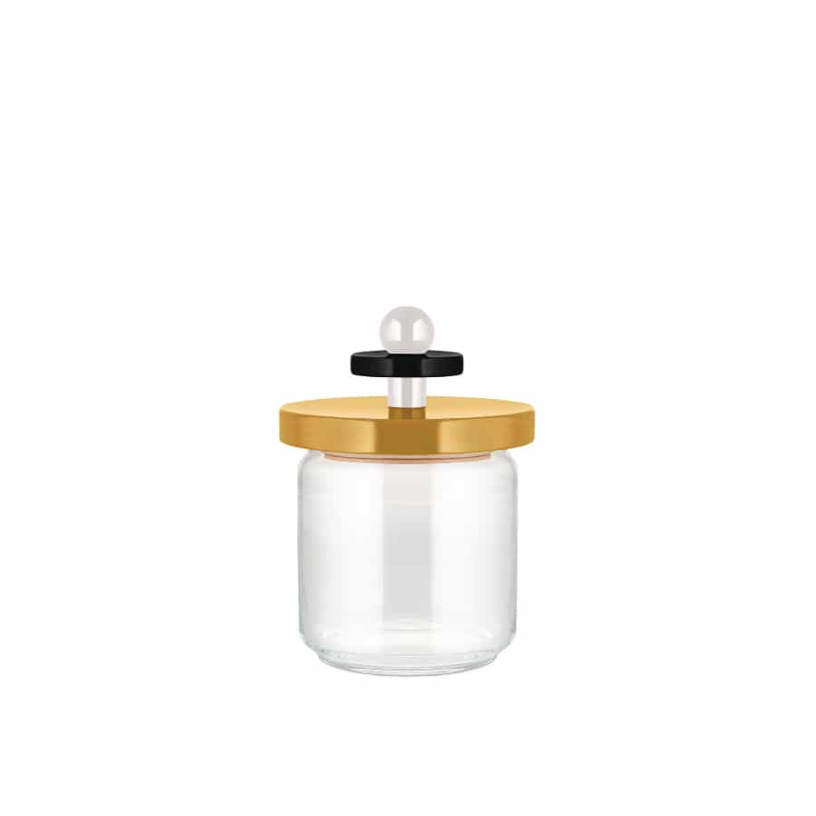 Ettore Sottsass reinterprets a kitchen classic with his unmistakable language of overlapping colorful volumes. The ideal jar for storing dry foods such as rice, pasta, biscuits, or powdered foods such as sugar, salt and coffee. The glass body and the hermetic seal keep the flavor and aroma of the products intact. Capacity 750ml, Diameter 12cm , Height 17cm.