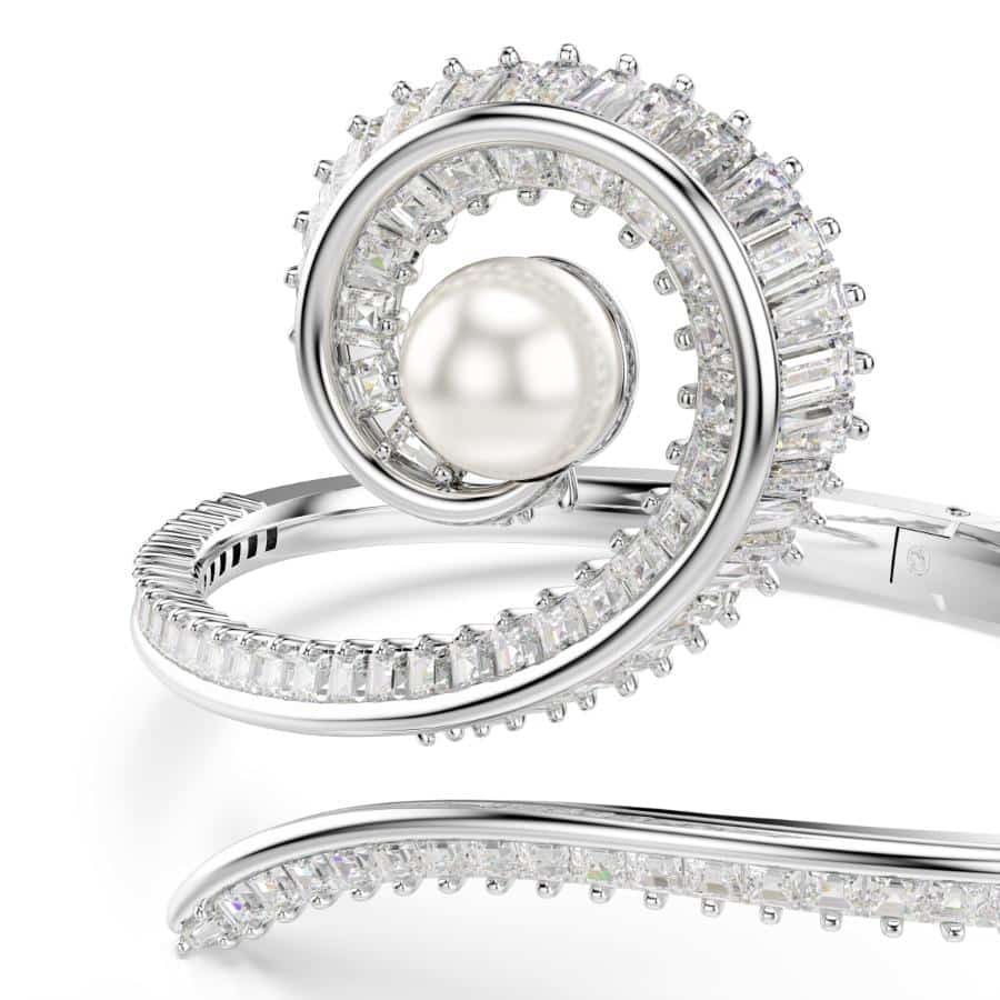 This music-inspired bangle combines elegance with creativity. Taking the abstract form of a treble clef, the rhodium plated design is beautifully spiraled and set with baguette-cut Swarovski Zirconia. For an extra touch of luxury, a single Swarovski Crystal Pearl is then placed at the center. The perfect way to give your style an upbeat and rhythmic infusion.