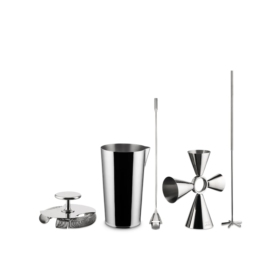 A special set designed for the preparation of mixed cocktails: a strainer, a mixing glass, a measure for cocktails, a mixing spoon and whisk. As soft in its line as it is strict in its design, The tendig box collection is designed by Giulio Iacchetti with the consultancy of mixologist Oscar Quagliarini, in a balanced synthesis between shape and function.