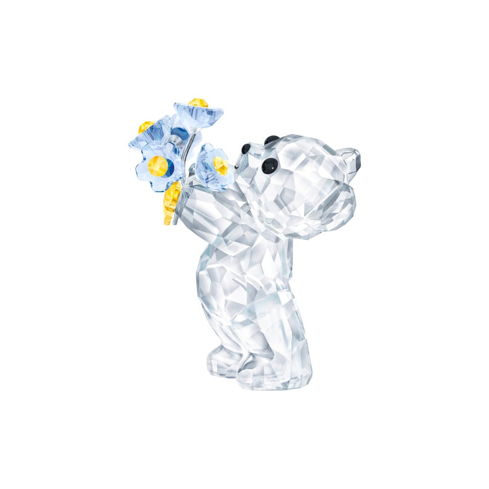 Swarovski's Kris Bear collection is loved all around the world for its cute, cheerful characters. Carefully crafted with 599 sparkling facets, this edition sweetly presents a bunch of forget-me-not flowers. Full of color and emotion, it would make a meaningful gift for someone special. Decoration object. Not a toy. Not suitable for children under 15.