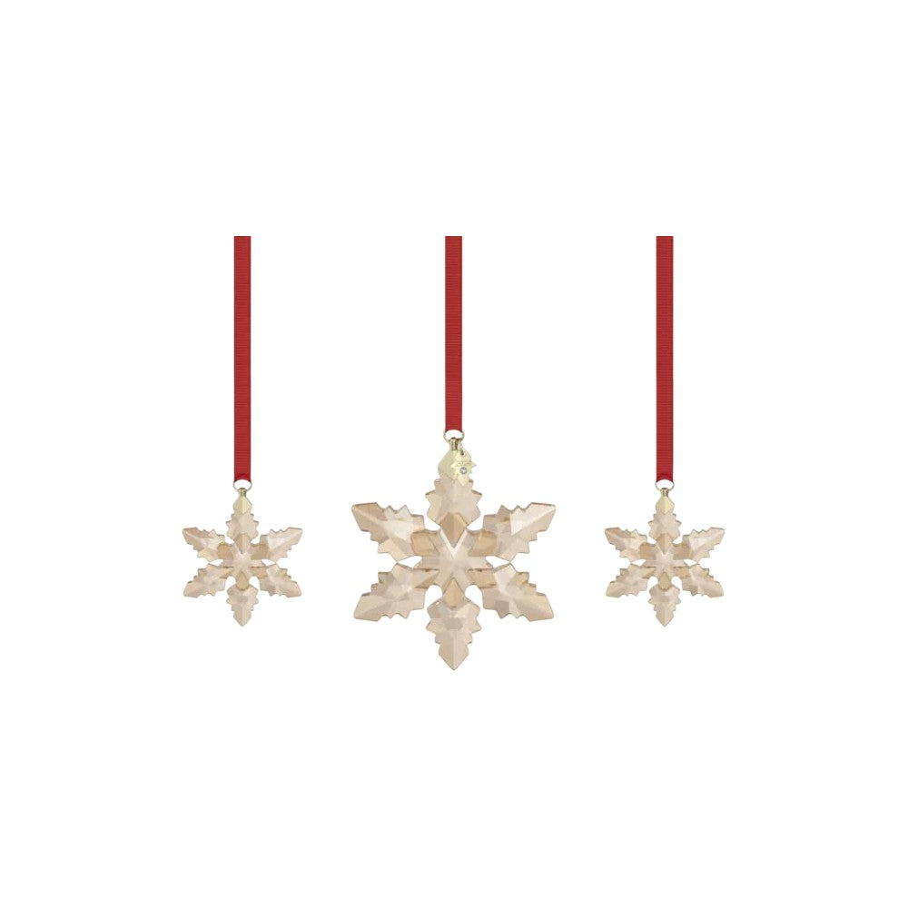 This glistening holiday set continues the beloved tradition of Swarovski’s Annual Edition Ornaments. The trio of gold-tone pieces takes inspiration from the unique beauty of snowflakes, realized with Swarovski’s unmistakable savoir-faire and mastery of precision. The set includes two smaller pieces and one large focal piece, showcasing 399 facets in total. Each snowflake is suspended from a red grosgrain ribbon with glossy champagne gold-tone accents, with the large star also featuring a tag engraved with “2024.” Designed for the holiday season, this commemorative set would make a truly spectacular gift or brilliantly illuminate your own festive décor. Decoration object. Not a toy. Not suitable for children under 15.