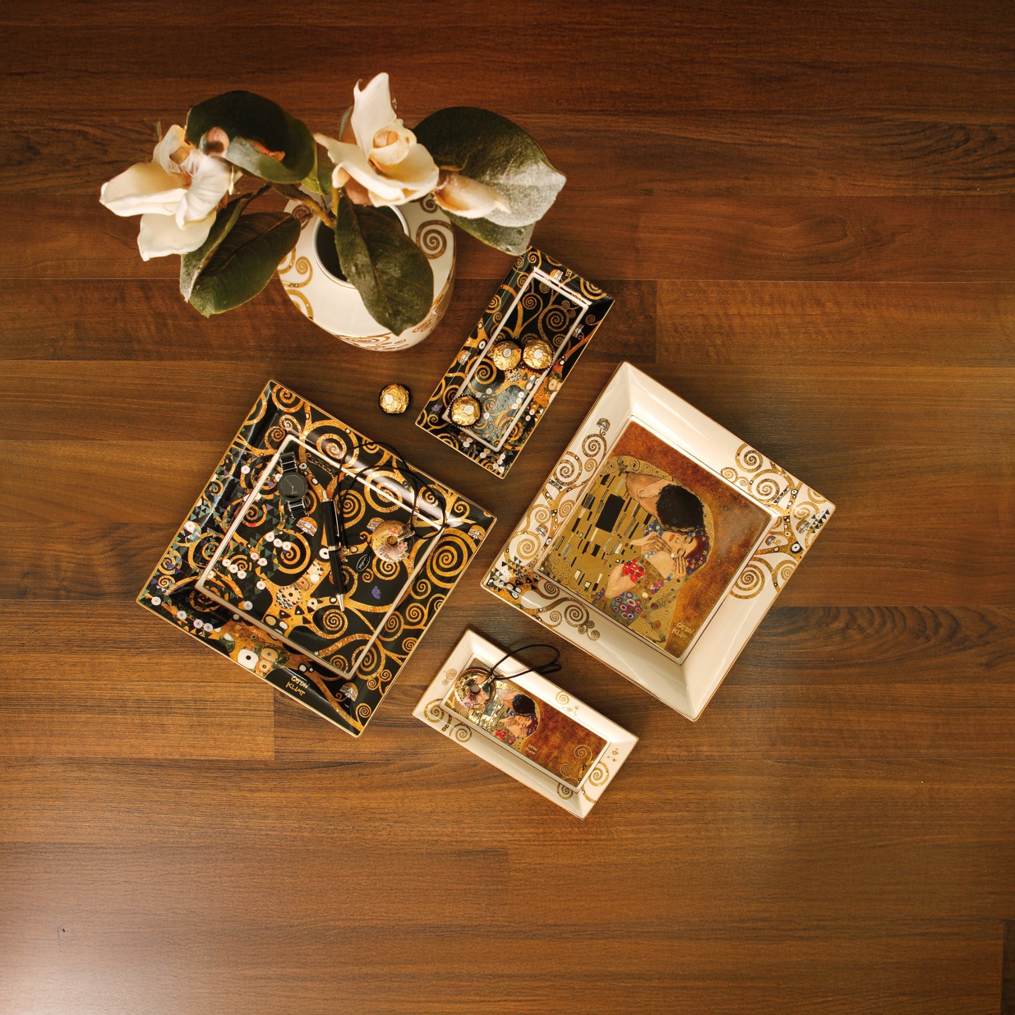 Beyond their decorative value, the functionality of some items not only creates a cozy atmosphere but also brings more joy to everyday life. Take, for example, this rectangular bowl, "The Kiss," with its genuine gold overlay—perfect for small delicacies, as a pen holder, or for jewelry. Impressive interior design that embodies artistic sensibility and refined taste. In the opulent works of his "Golden Period," figures and ornament merge into compositions of unique sensuality. Gustav Klimt (1862–1918), co-founder of the Vienna Secession, united the various currents of international Art Nouveau in his magnificent paintings, becoming its most important representative. Transcending all temporal and spatial boundaries, his most famous painting, "The Kiss," is considered the quintessential allegory of love. Hands make Goebel—we have remained true to this philosophy. We create individual masterpieces. Historical motifs are adapted for contemporary use. Selected raw materials and meticulous attention to detail in the manufacturing process guarantee our superior quality. Every step in the manufacturing process is carried out by skilled professionals and is entirely handcrafted. In addition to the quality of our materials, the modeling, casting, and firing, nuanced decorations define the high quality of our products and make each piece a unique, one-of-a-kind item. Size: Length-24cm x Width-12cm x Height-2cm.