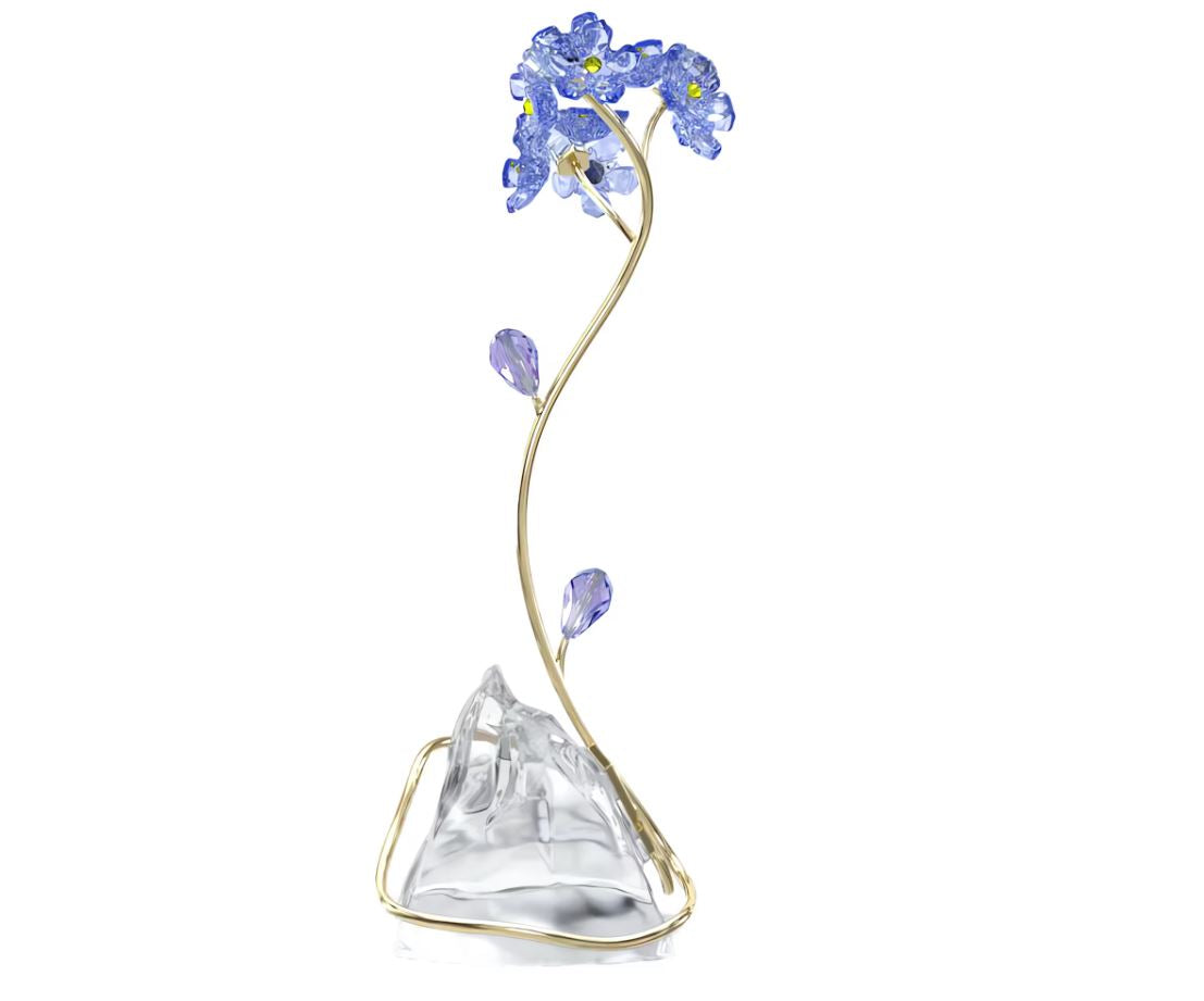 Crafted with meticulous skill, this stunning creation captures the beauty of one of nature’s most eye-catching flowers. The blue forget-me-not is produced with 876 light-catching facets, displayed atop a gold-tone metal stem that gracefully entwines across a natural unfaceted crystal base. Representing true love and faithfulness, this freestanding design would make a truly impressive gift for a loved one, serving as a permanent reminder that they’re in your thoughts. No vase or base required. Decoration object. Not a toy. Not suitable for children under 15. Size: 11.2 x 4 x 4.3 cm