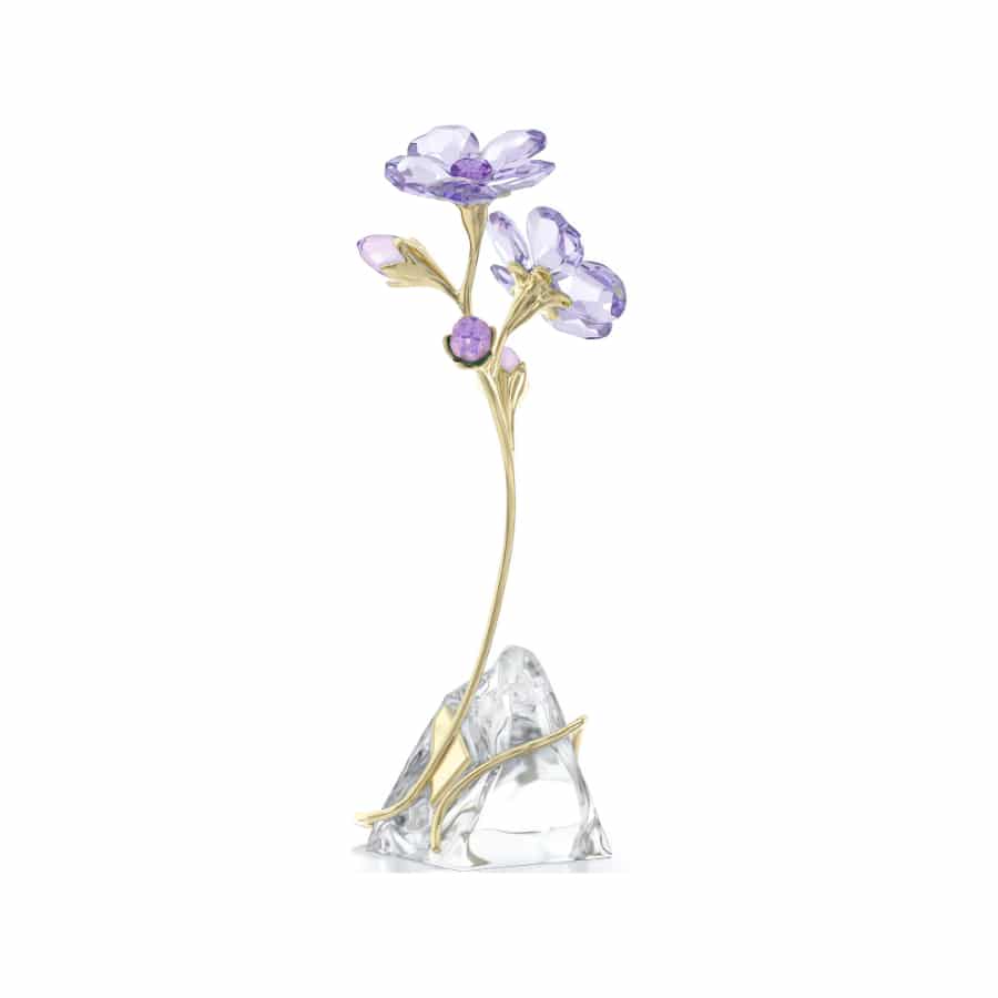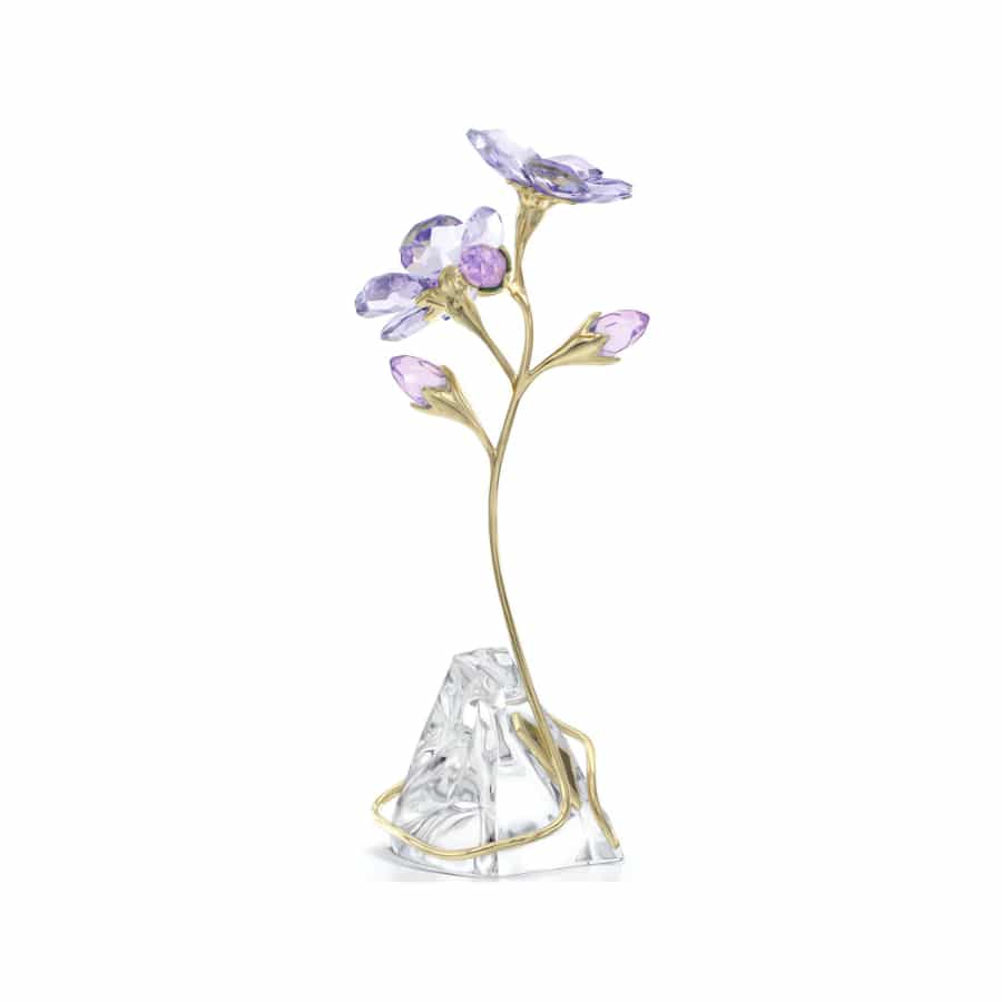 The Rozanne Geranium is loved within nature for its masses of beautiful blooms that shimmer in the breeze. This radiant tribute has captured the iconic flower with 328 facets, including bright blue and purple petals with a wondrous Shimmer effect. The design is completed with a champagne gold-tone metal stem that wraps elegantly around a natural, unfaceted crystal base. Place this display anywhere in your home to provide year-round color and joy. Decoration object. Not a toy. Not suitable for children under 15.
