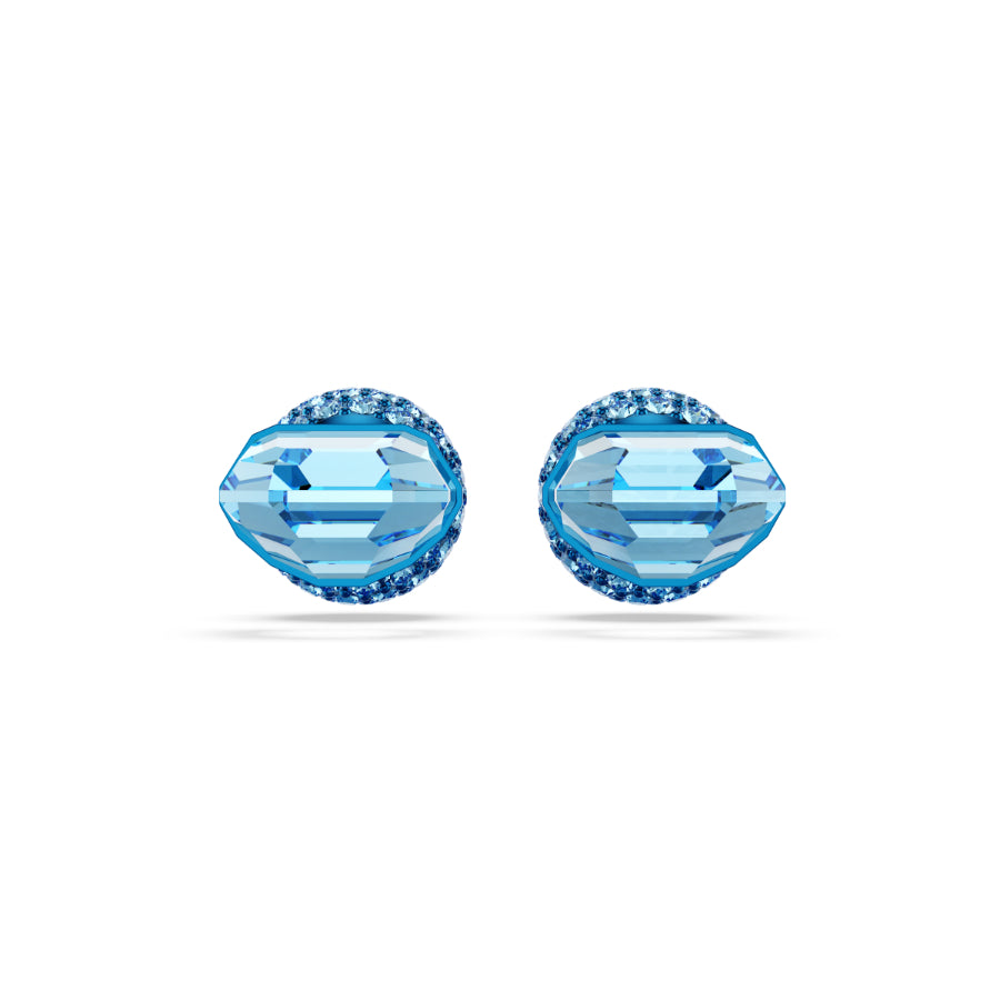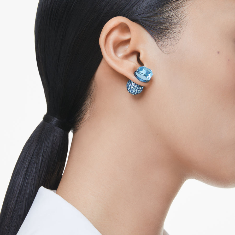 Add a pop of cool color to your look with these aquamarine studs. The blue design has two equally captivating sides with a faceted half-cut crystal on the front and a dazzling ball closure on the back, decorated with a pavé of round-cut crystals. A vibrant piece that will inspire your style creativity. Size: 1.4 x 2.4 cm.