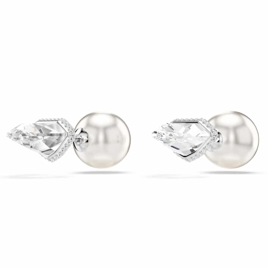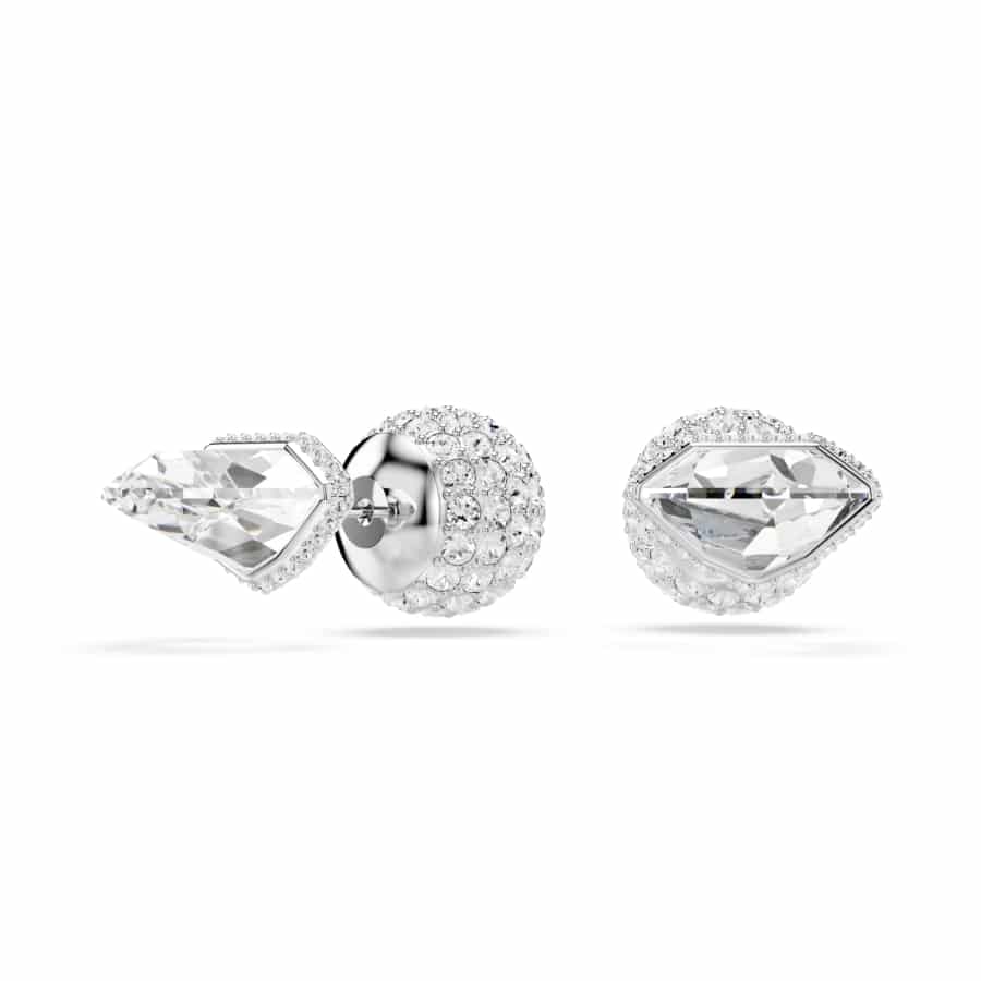 These versatile Lucent studs encourage you to get creative with your styling. Each rhodium plated piece features a faceted clear crystal at the front and two options for the back: a smooth ball closure in white, or a ball adorned with a pavé of round-cut crystals. A unique piece that will inspire your imagination. Size: 1.4 x 2.6 cm.