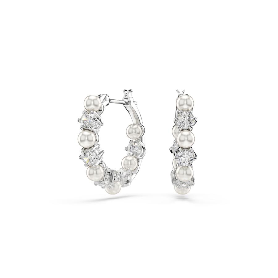 These pierced Matrix earrings are a unique and contemporary twist on the classic hoop style. Each piece is rhodium plated and adorned with alternating Swarovski Zirconia and Swarovski Crystal Pearls. They’re a statement of sophistication that will take any outfit from ordinary to outstanding.