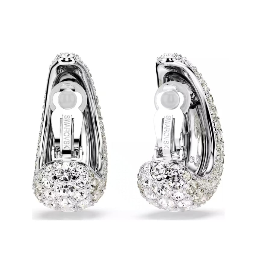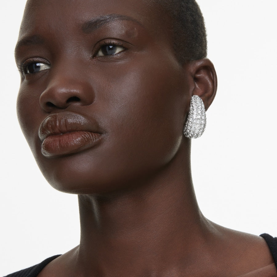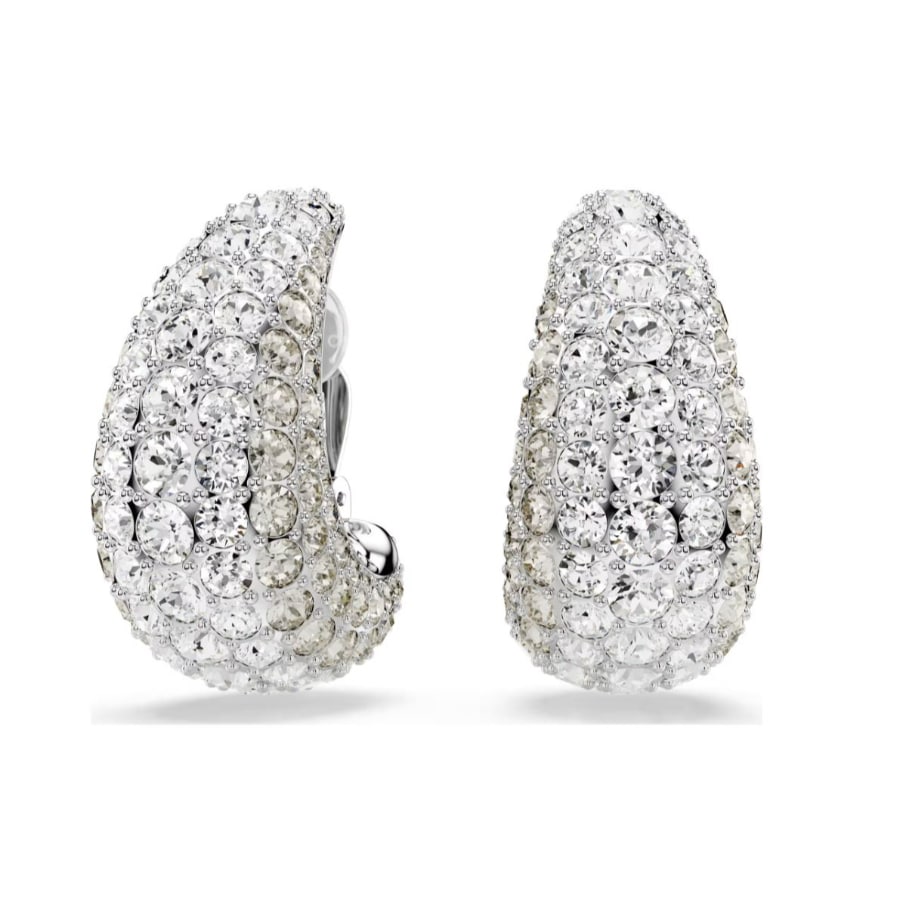 With their curved lines and captivating radiance, these Sublima clip earrings will add intrigue to any outfit. Each rhodium plated piece features a domed metal base for added volume, covered with a pavé of clear crystals. The Meteora pattern, made up of different-sized crystals, dazzles with mesmerizing effect. Combine with similar Sublima pieces for maximum glamour. Size: 3.5 x 1.7 cm.