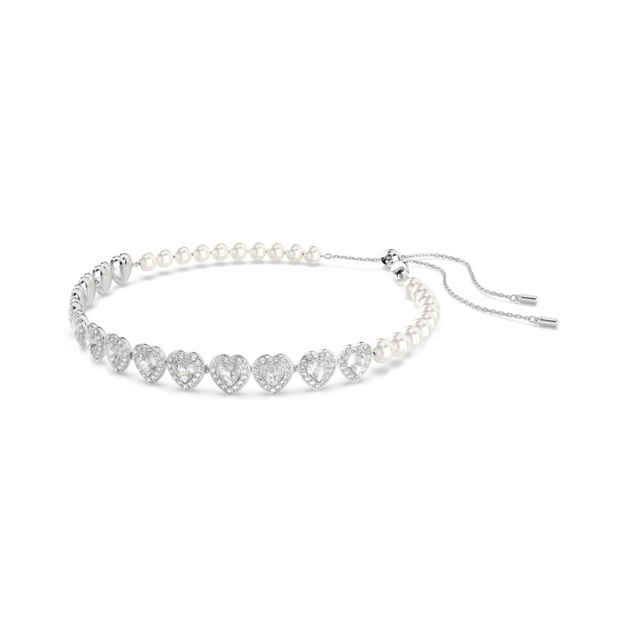This radiant choker was made for an intense expression of love. The rhodium plated design is partly decorated with luxurious Swarovski Crystal Pearls, while at the front, there is a row of heart-shaped crystals, each surrounded by a glittering halo of clear pavé. A sliding closure at the back means you can adjust the jewelry to your perfect fit. Pair this bold necklace with other matching jewelry to create your own romantic combinations.