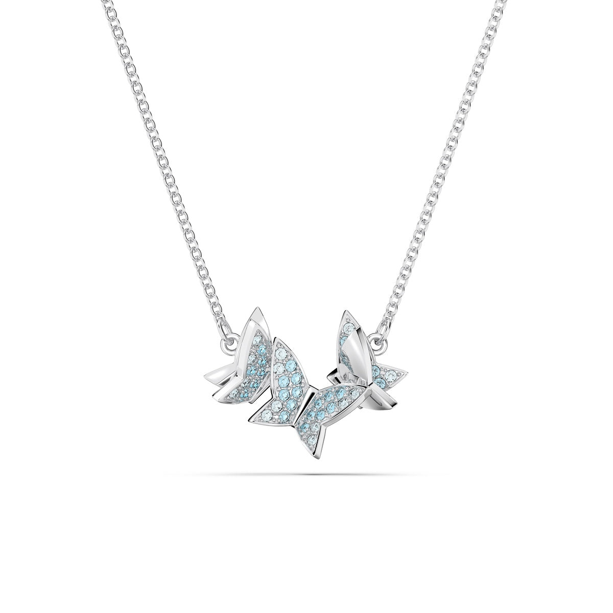 This elegant Lilia necklace features a central motif of floating butterflies adorned with shimmering blue pavé on a rhodium plated setting. This is an easy choice to enhance your outfit with a touch of nature-inspired wonder. Minimum length: 38 cm, Maximum length: 43 cm, Width: 2 cm.