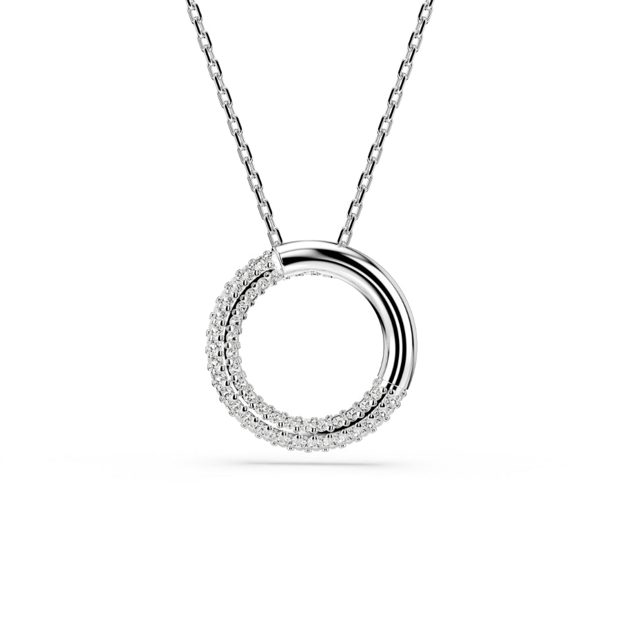 Radiating a halo of light, this mesmerizing Dextera pendant features a central hoop half encrusted with a pavé of clear crystals. The rhodium plated design is suspended from an elegant chain and completed with a lobster closure. The perfect piece to infuse your everyday style with subtle shimmer. Length (minimum - maximum): 50 - 57 cm. Motif size: 1.9 x 1.9 cm.