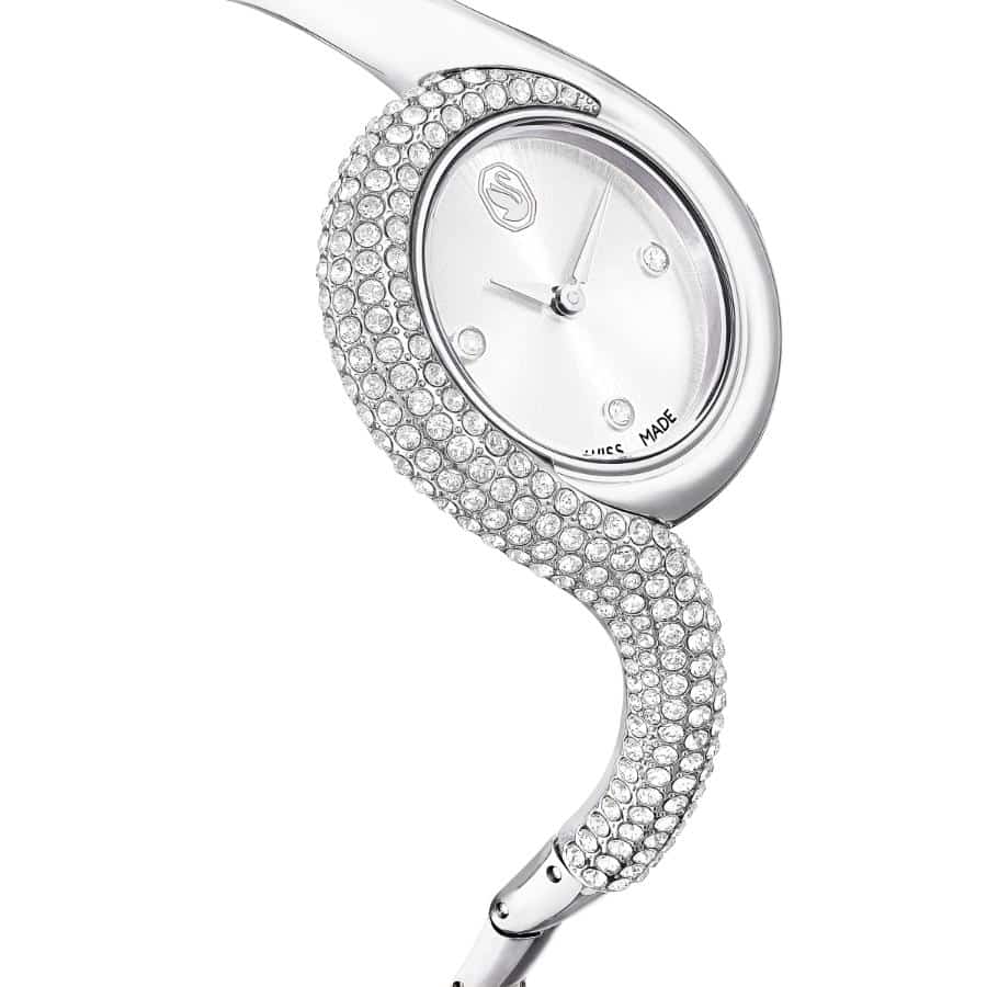 This captivating Dextera watch takes its cues from the classical timepieces of a vintage era. The 29mm stainless steel design is creatively embellished with a pavé of clear crystals over half the bezel, as well as half the bracelet. The minimalist dial features a sunray effect and is accented only with three crystal hour markers and a swan logo at 12 o’clock. A total of 203 crystals are used in the creation of this timepiece, including the single crystal that is placed within the crown. This Swiss made watch is water resistant to 50 meters and is a pure expression of Swarovski sophistication.