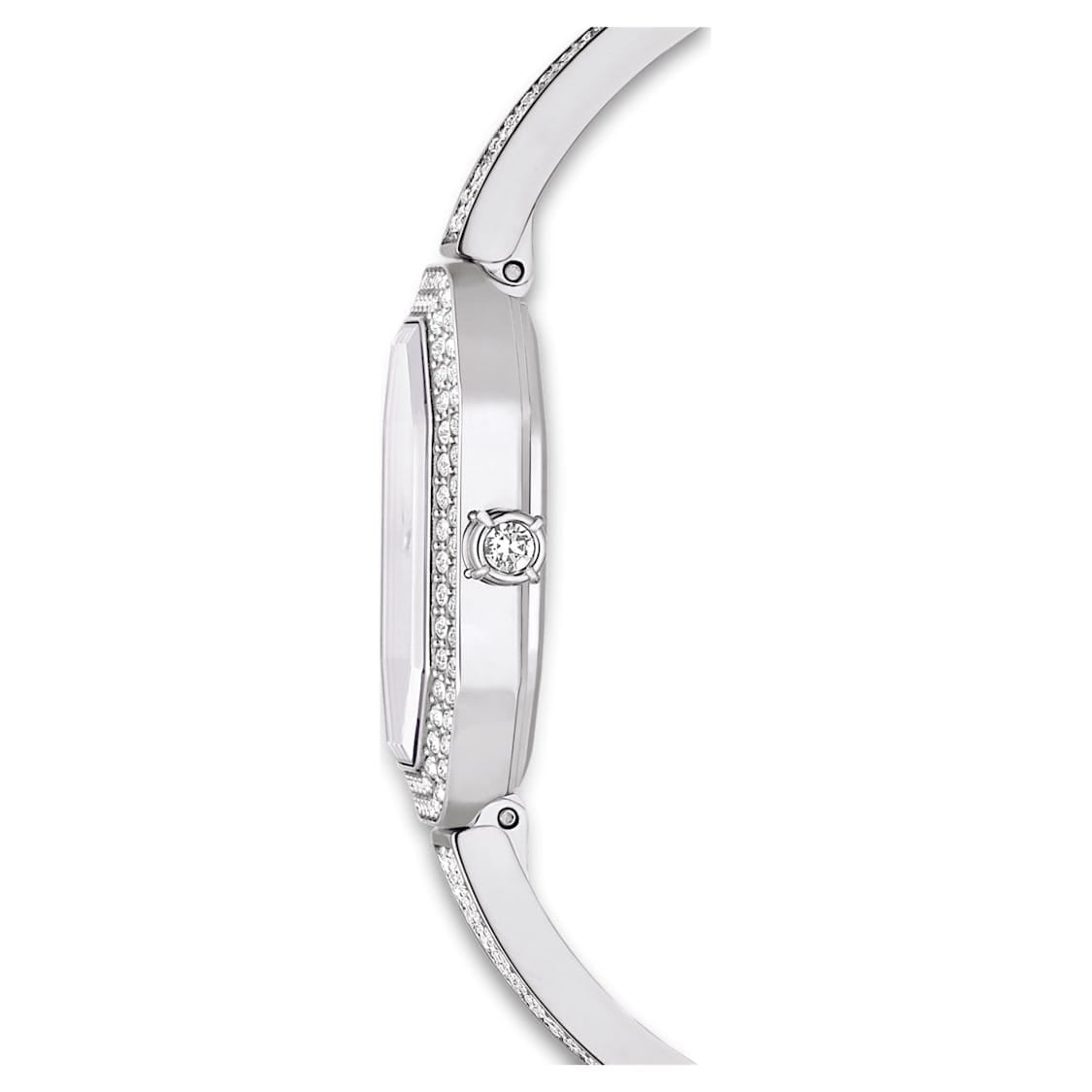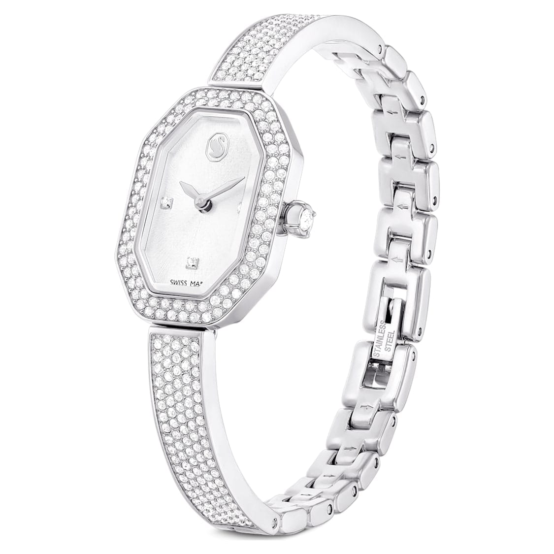 Crafted in the iconic octagon shape of Swarovski, this unique Dextera bangle watch is made for maximum glamour. The stainless steel case is 20mm x 30.5mm and is adorned with a pavé of 92 crystals on the bezel. This provides a perfect frame for the sunray dial, which features a swan logo at 12 o’clock and three crystallized index markers. Along with a single dazzling crystal set in the crown, the watch is also brought to life by 194 crystals set along the adjustable bracelet, providing exceptional beauty at every hour. This Swiss made watch is water resistant to 30m and combines joyful extravagance with signature Swarovski savoir-faire. Case size: 30.5 mm x 19 mm. Watch strap length: 16 cm.