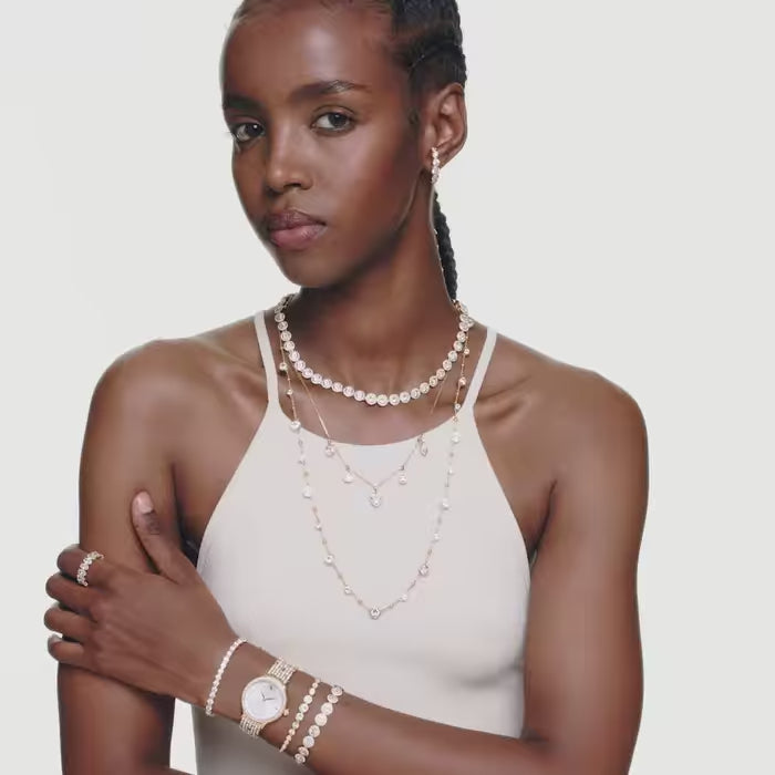Adorned with 232 individual crystals, this glistening Imber watch is Swarovski’s finest expression of timeless elegance. The 31 mm stainless steel design is gold-tone finished and features a pavé bezel set with 52 clear crystals, while one additional crystal is also placed within the crown. On the sunray dial, 11 crystals in small and large sizes are used to mark the hours, along with a swan logo at 12 o’clock. Around the wrist, the watch’s most distinctive feature is the adjustable seven-link bracelet, which is stunningly set with 168 round-cut crystals. This Swiss Made watch is water resistant to 50 metres and matches seamlessly with Swarovski’s selection of Imber jewellery.