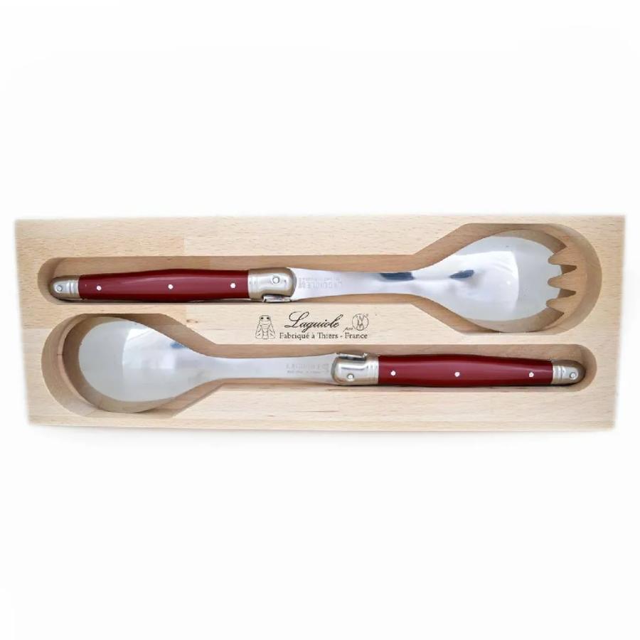 The AndreVerdier Laguiole Salad Serving Set with mirror finish will looks stunning in any salad bowl. The set comes with a salad fork and a salad spoon and is beautifully presented in a wooden box. The handle has the traditional trademark bee logo and is riveted onto the full tang blade as with all AndreVerdier utensils. There is a large range of colours to choose from, and they make a great gift!