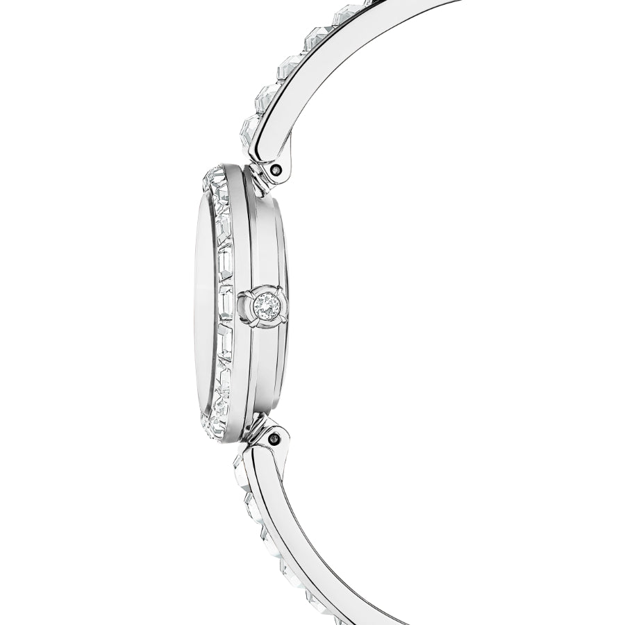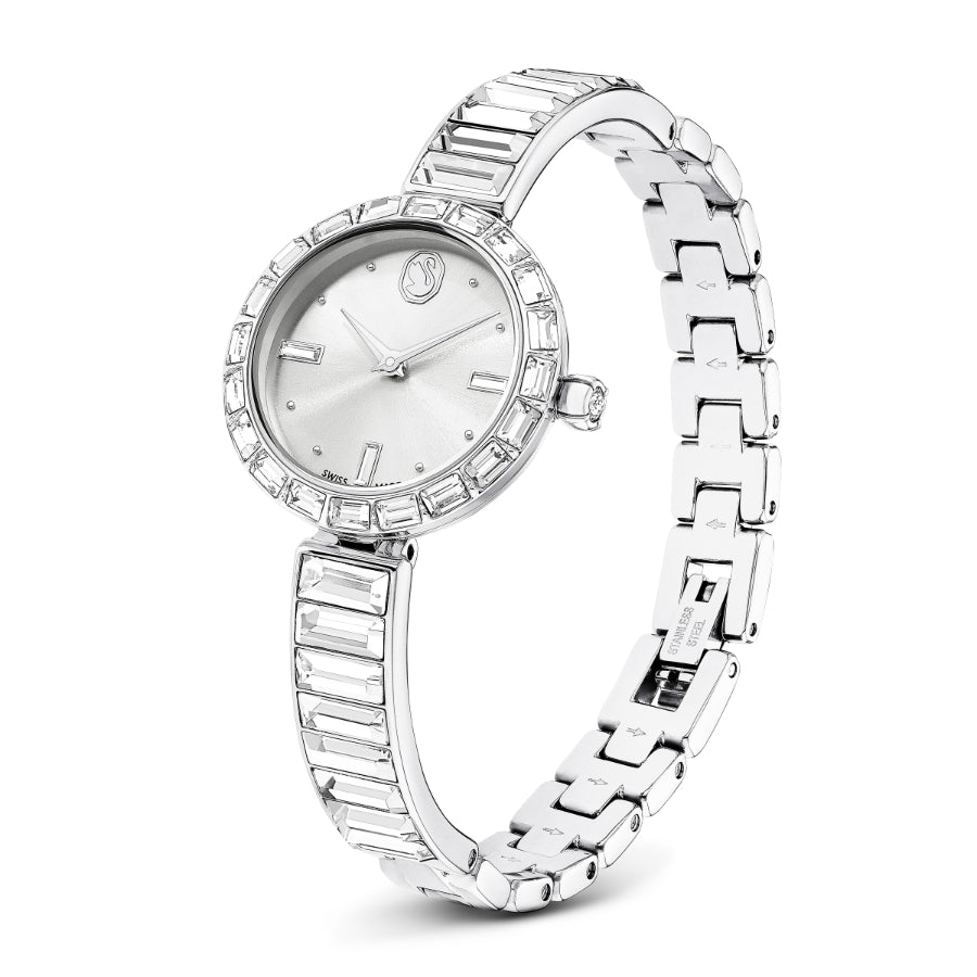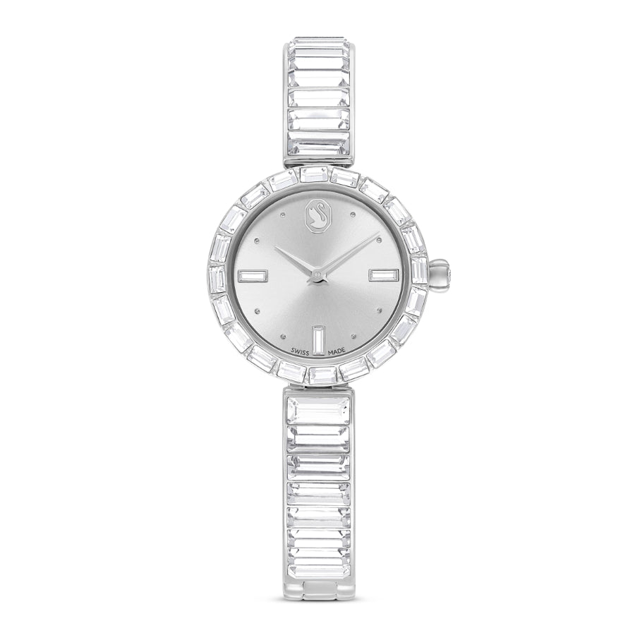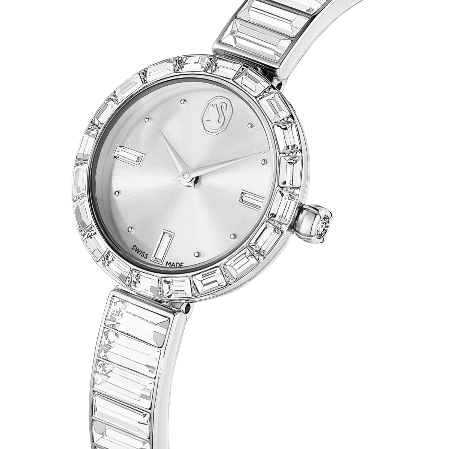 Elegance is amplified with crystals in this beautiful jewelry-inspired timepiece. The 25mm stainless steel design is encircled by a bezel with 20 baguette-cut clear crystals, while a single crystal is set within the crown. Baguette-cut crystals also highlight three index markers on the silver-tone dial, which also features a swan logo at 12 o’clock. Around the wrist, the bangle-style bracelet is adorned with 16 baguette-cut crystals and is fully adjustable for a comfortable fit. The Swiss made watch is water resistant to 50 meters and is the ideal accessory to illuminate every facet of life. Watch strap length: 16.5 cm. Case size: 25 mm x 25 mm.