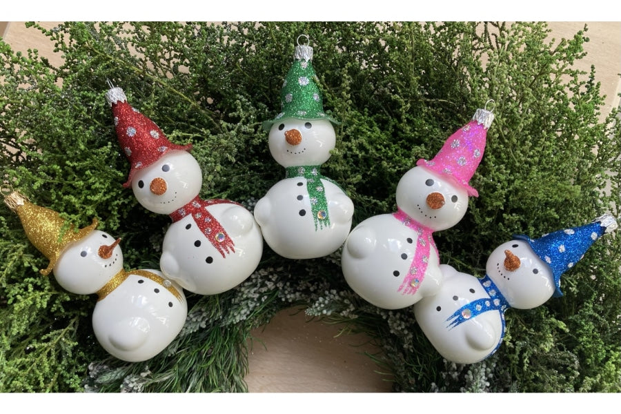 Mouth blown glass ornament in alabaster white decorated with gold glitter hat and scarf and embellished with a Swarovski crystal.Because each bauble is hand decorated, the decoration and finish of each item may vary and this adds to the uniqueness of your keepsake.