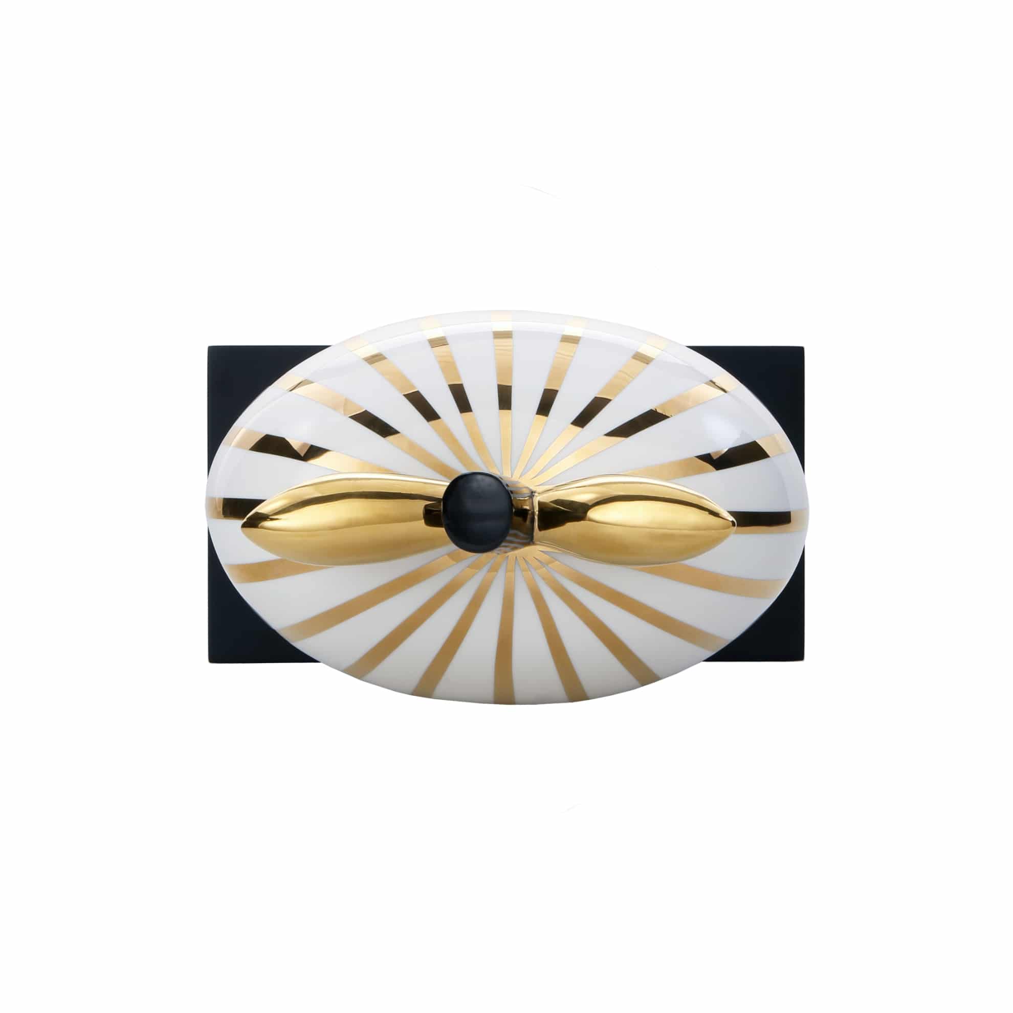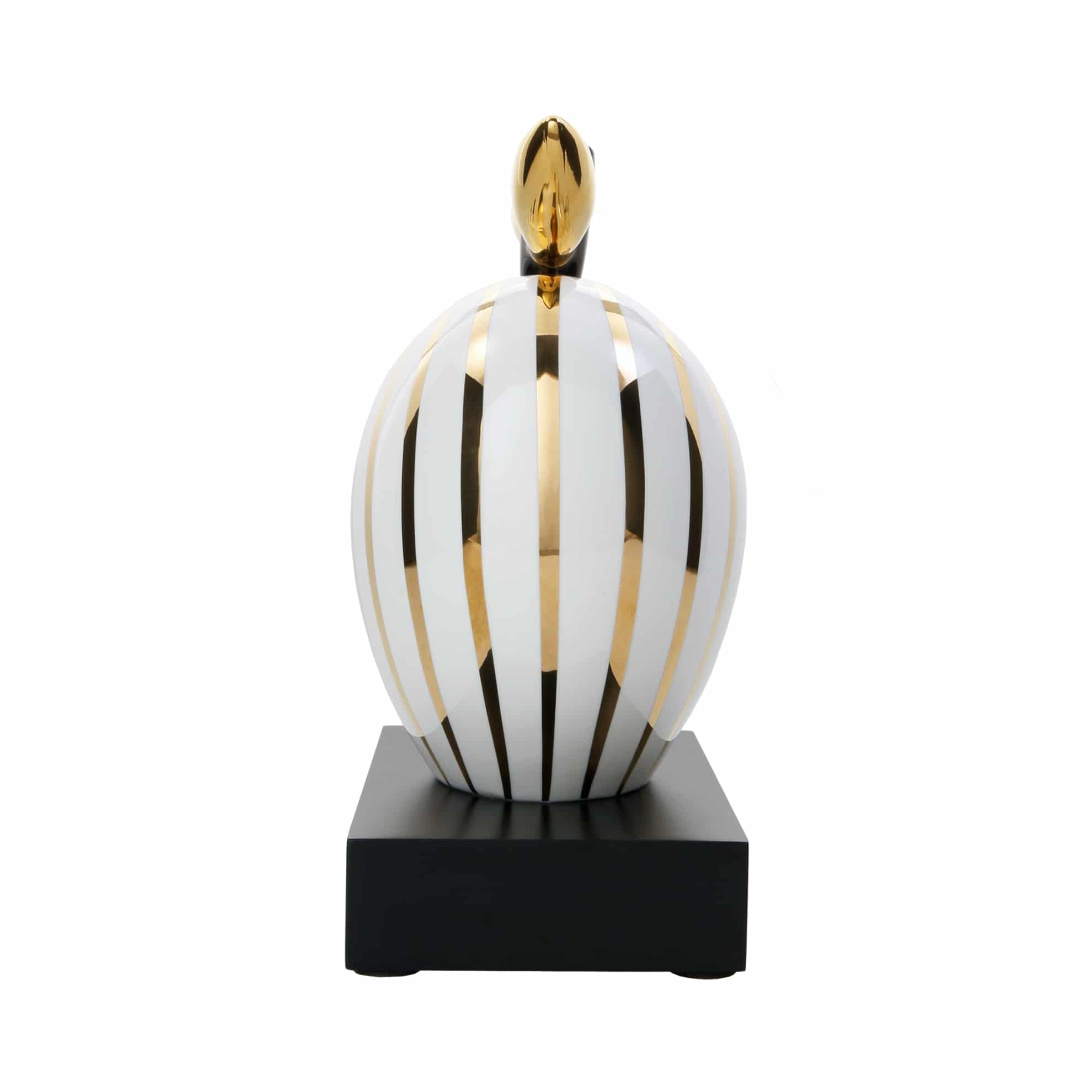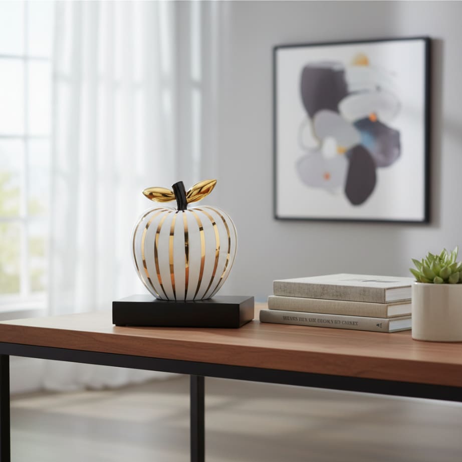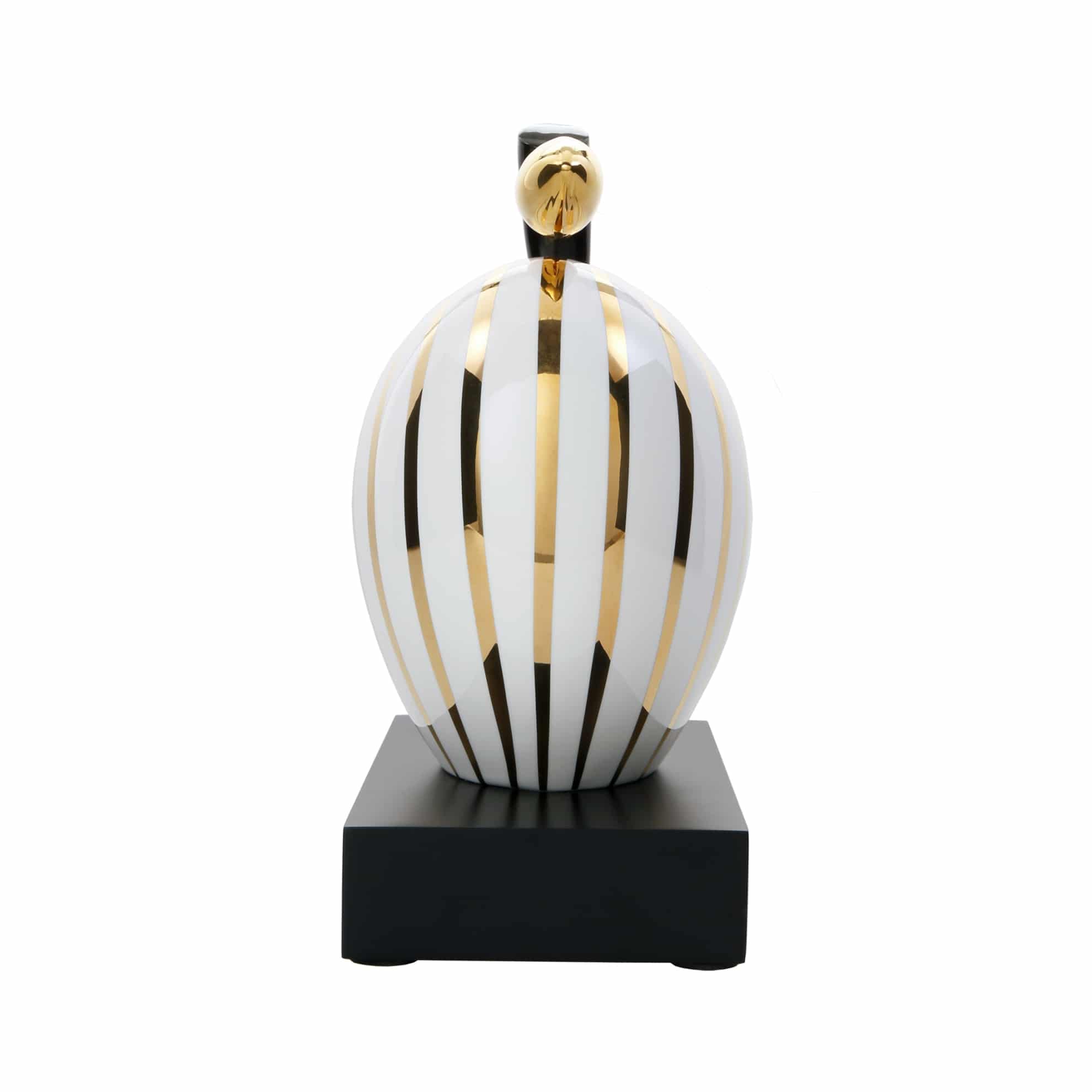 Enjoy the exciting design world of Studio 8, rooted in the classic Goebel universe. The apple figurine, a porcelain piece on an MDF base, is a true eye-catcher and simply beautiful! Decorative object 'Golden Sunlight' Limited Edition: 99 pieces with certificate. The apple is a symbol of good taste in every respect. Its symbolic power is used in the areas of lifestyle, health, art, and technology. The traditional association of the fruit with power and fertility has endured to this day. Studio 8 also celebrates good taste with its Art & Apple series, transforming the apple into a decorative status symbol. Whether glazed white, adorned with meaningful miniature brass figures, or completely encased in real gold, it rises exclusively and impressively on its base. Studio 8 is more than design – it's a statement. A consistent stance, independent of space and time. The objects in the collection unfold their expressive power through understated design. The focus is on the high-quality material and the symbolic power of sophisticated craftsmanship. The silhouettes are uncluttered, the surfaces massive, the structures elemental - the essential in its purest form through clear design. Size: Length-24.5cm x Width-14cm x Height-28cm.