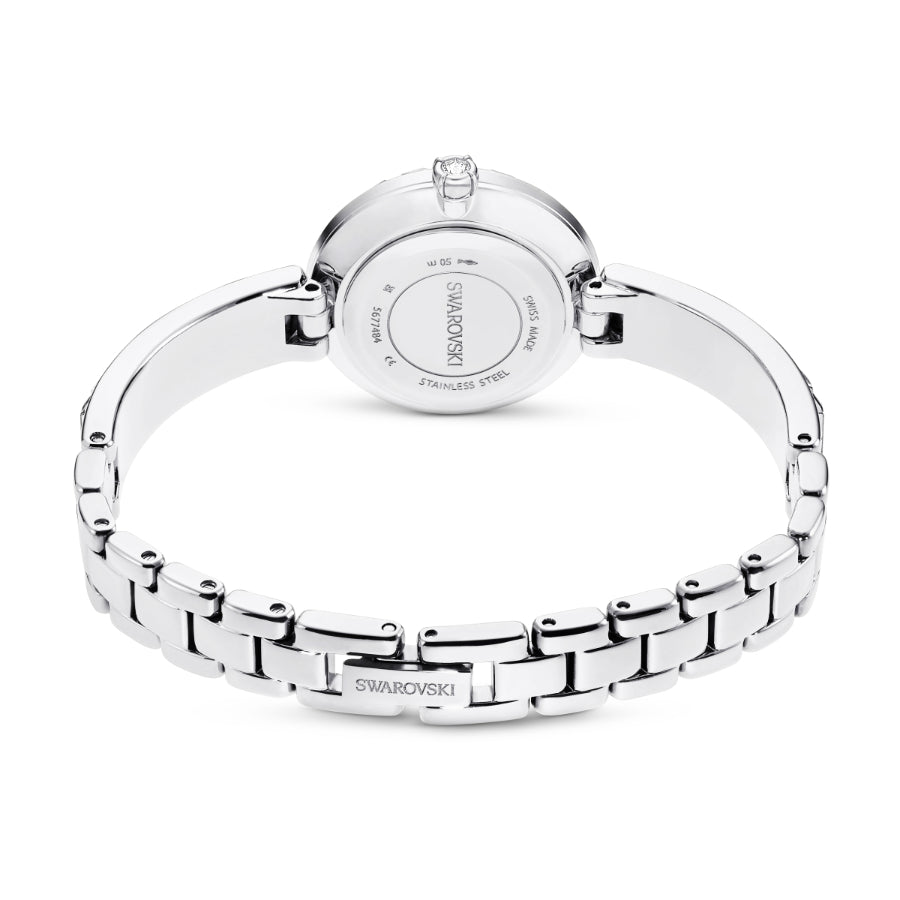 Elegance is amplified with crystals in this beautiful jewelry-inspired timepiece. The 25mm stainless steel design is encircled by a bezel with 20 baguette-cut clear crystals, while a single crystal is set within the crown. Baguette-cut crystals also highlight three index markers on the silver-tone dial, which also features a swan logo at 12 o’clock. Around the wrist, the bangle-style bracelet is adorned with 16 baguette-cut crystals and is fully adjustable for a comfortable fit. The Swiss made watch is water resistant to 50 meters and is the ideal accessory to illuminate every facet of life. Watch strap length: 16.5 cm. Case size: 25 mm x 25 mm.