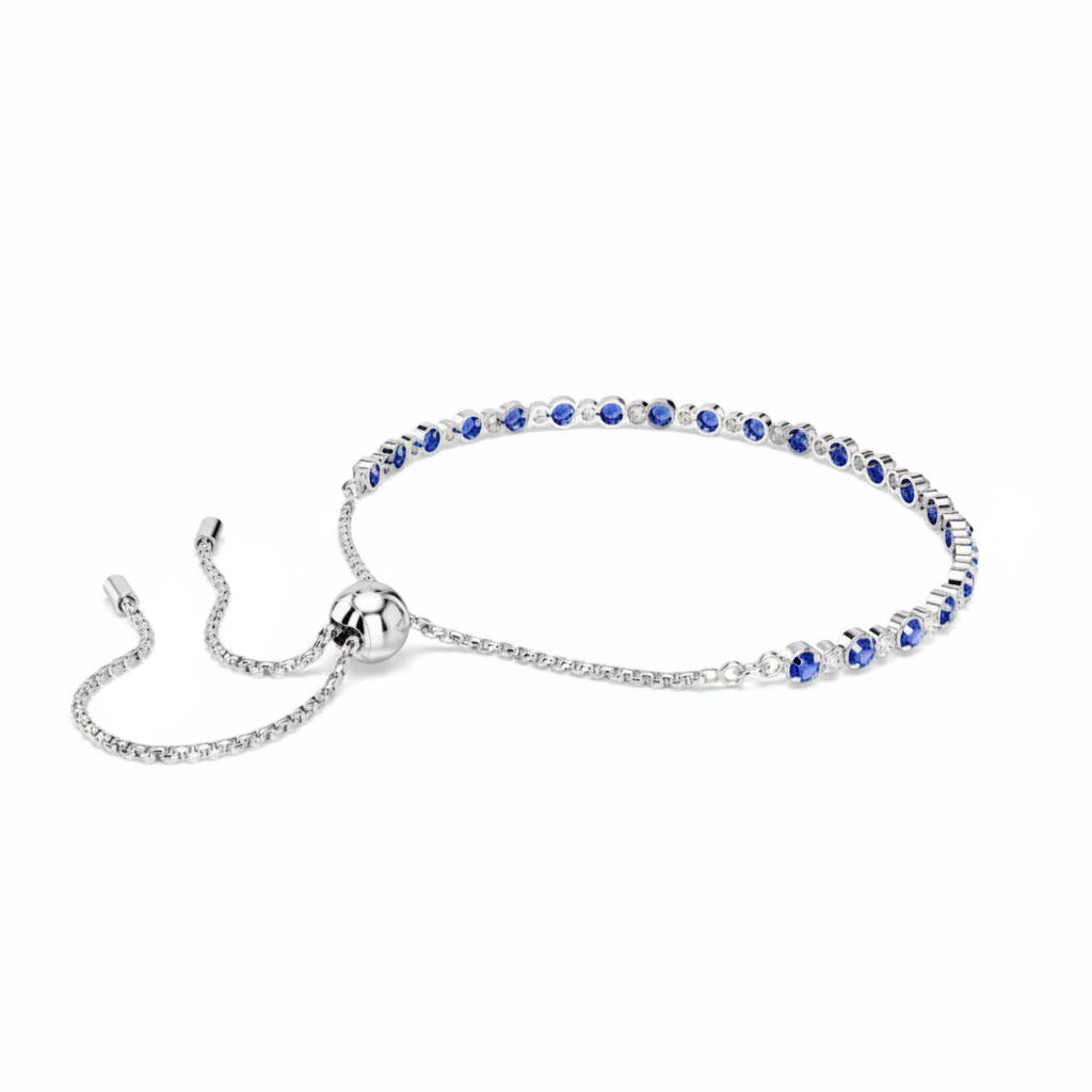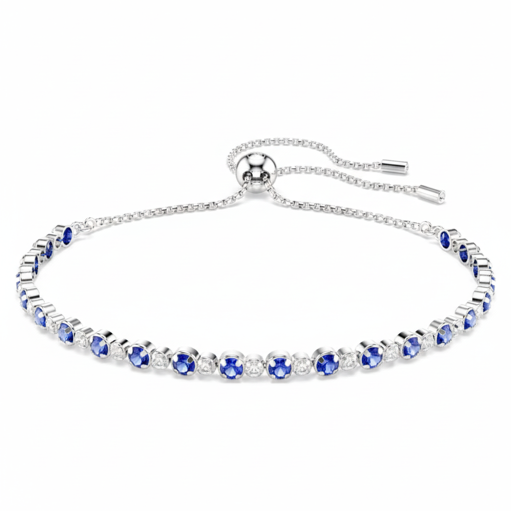 Work wonders with this elegant yet eye-catching Tennis bracelet from the Matrix family. The design is formed from a dazzling row of deep blue and clear Swarovski Zirconia and finished with sleek rhodium plating. The sliding closure ensures a made-for-you fit.