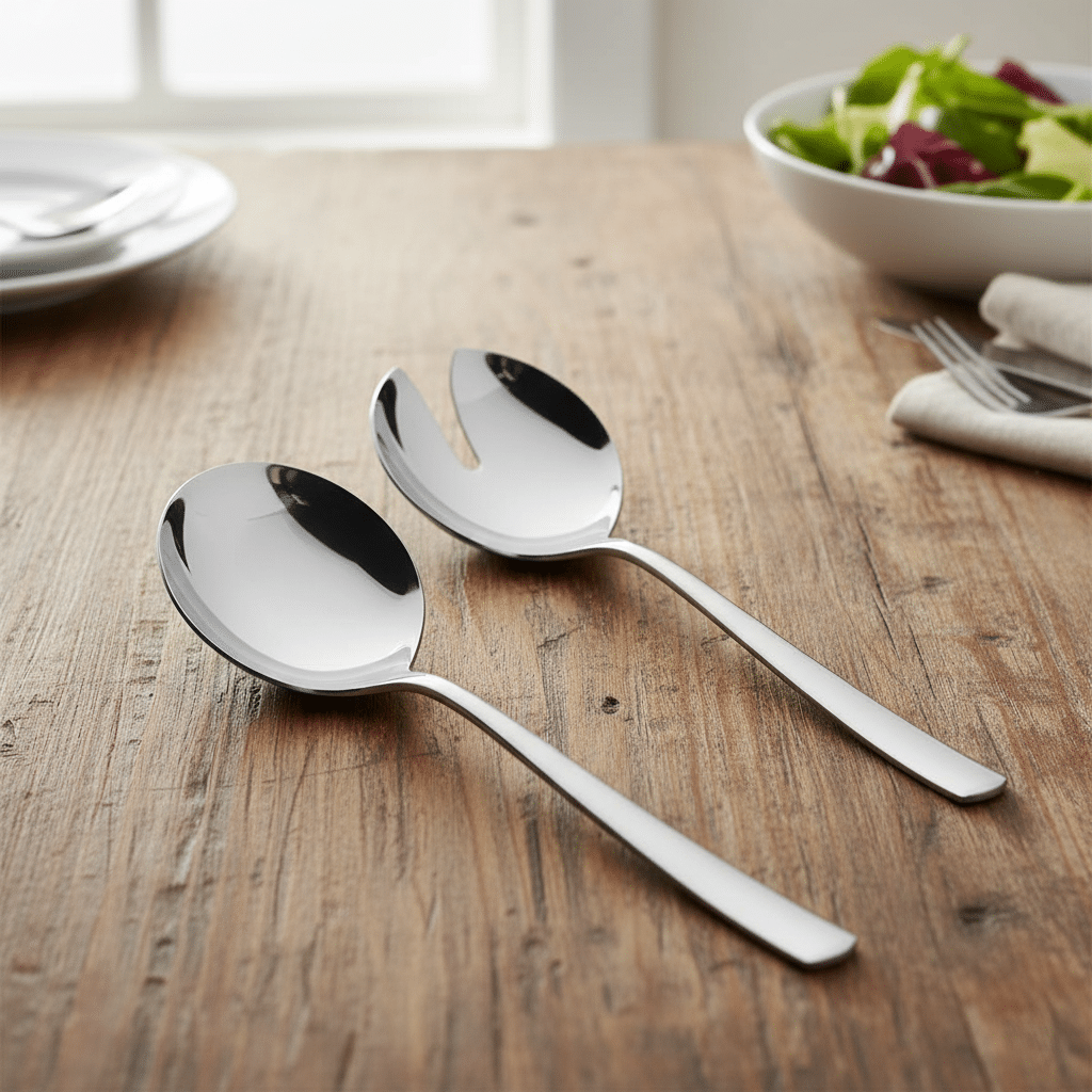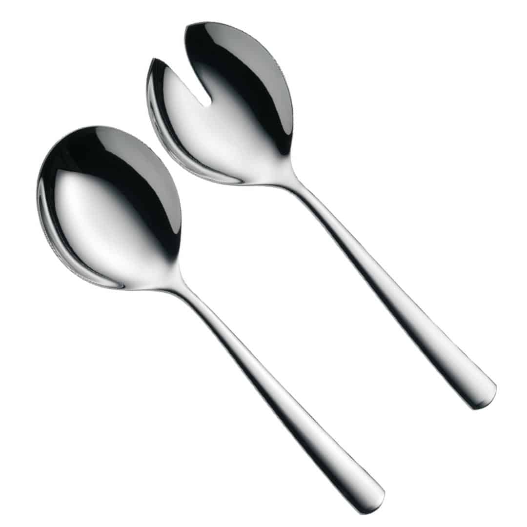 Mix, portion, serve. The WMF Boston Salad Servers are perfect for serving fresh salad. The two-piece spoon set consists of wide, flat bowls to portion the salad while allowing any excess sauce to drain away before serving. The long handles of the cutlery make it easy to use and prevent the servers from slipping into the salad bowl.